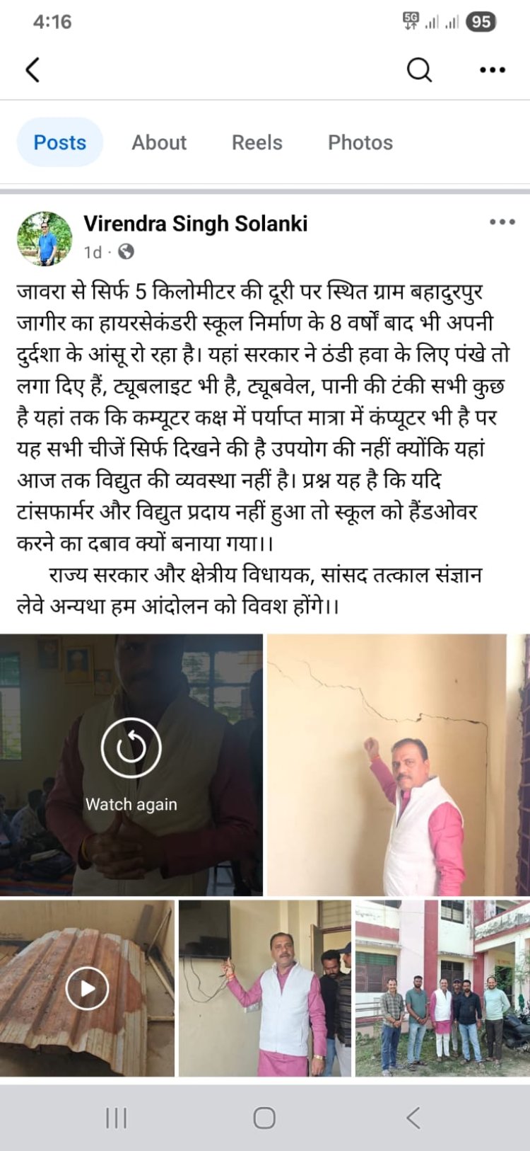 कांग्रेस नेता सोलंकी ने गुरुवार को ग्राम बहादुरपुर जागीर में सरकारी स्कूल का निरीक्षण किया और वहां पर बिजली कनेक्शन नहीं होने से बच्चों को हो रही असुविधा का मुद्दा उठाया। उन्होंने एक वीडियो बयान पोस्ट करते हुए कहा कि स्कूल में लैब है लेकिन लाइट नहीं होने से बच्चे कंप्यूटर नहीं चला पा रहे। कक्षाओं में पंखे नहीं चल रहे। यहां ट्यूबवेल है लेकिन मोटर नहीं चल रही। मेरा विधायक से निवेदन है कि यदि जन्मदिन की खुमारी उतर गई हो तो वह स्कूल में जाकर बच्चों की समस्याएं देखें और उनका हल करवाए।