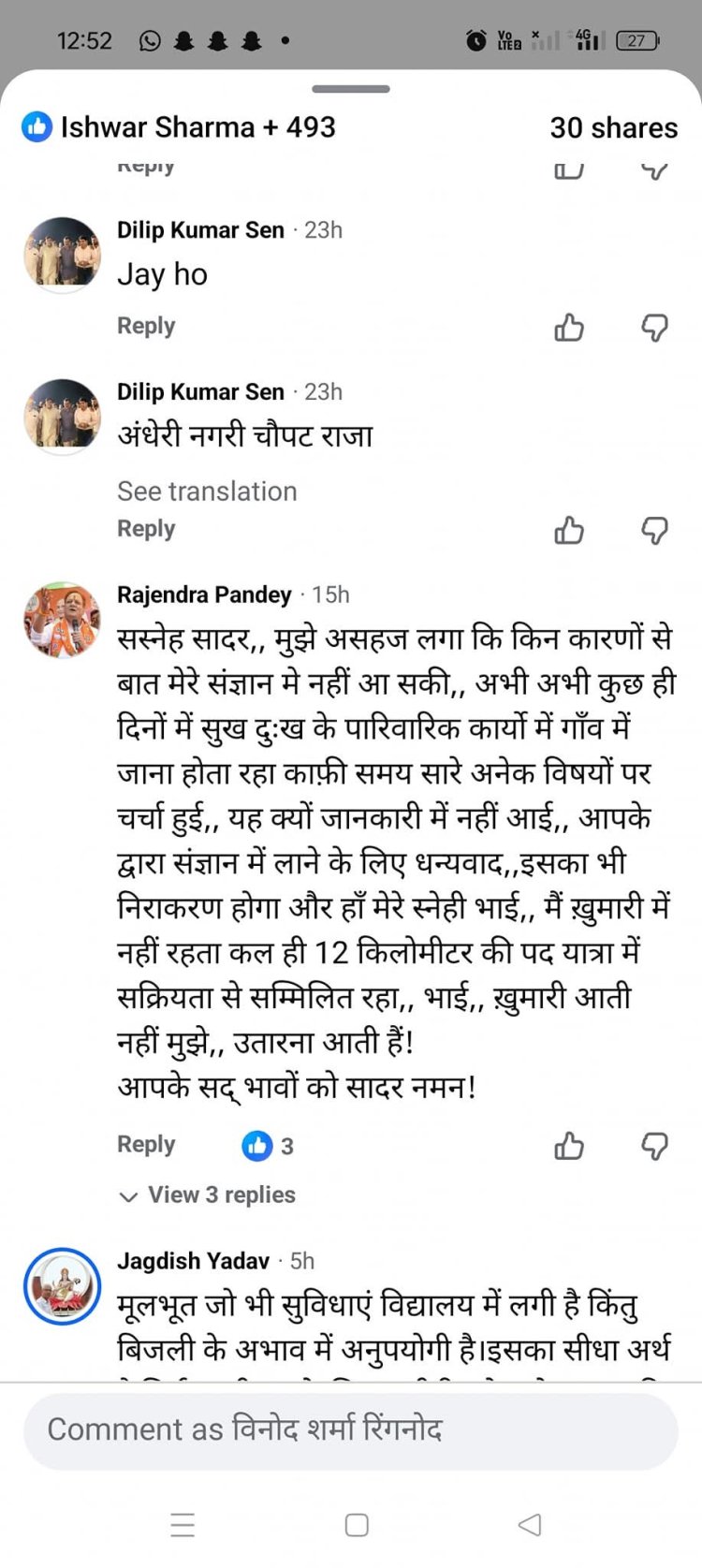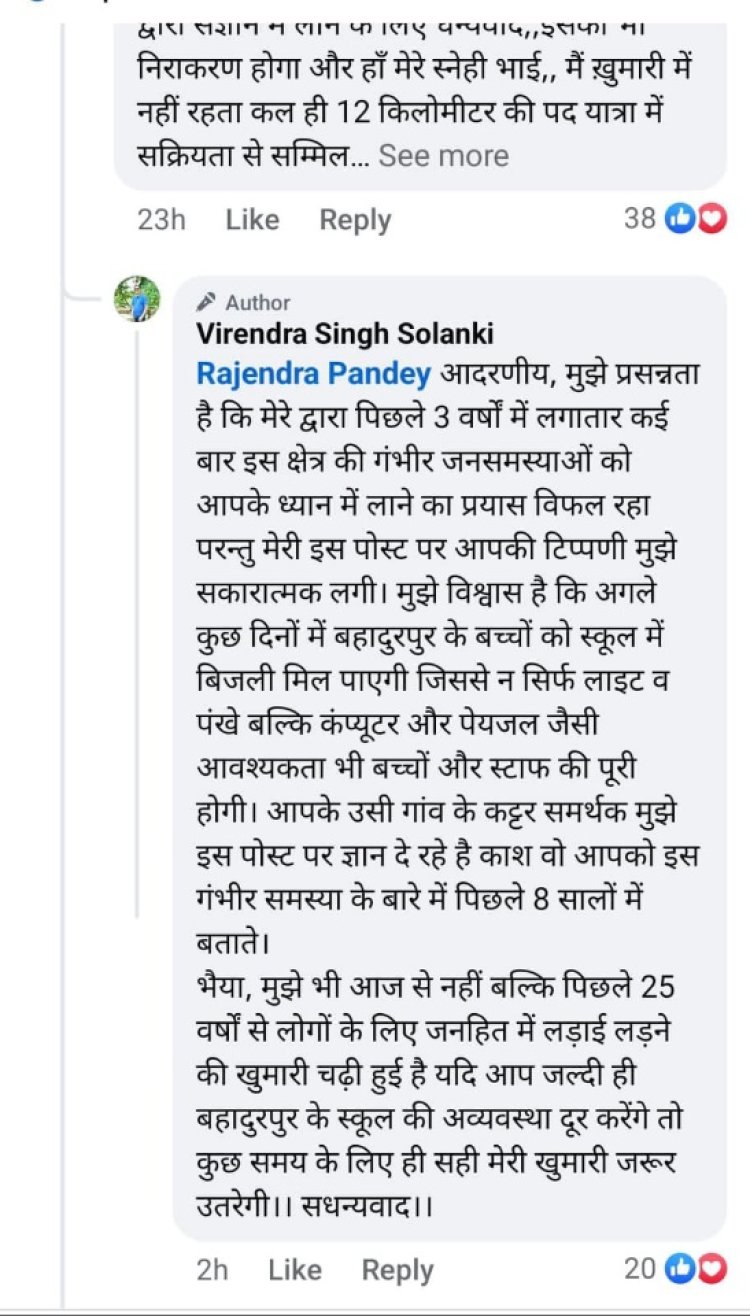 इसी फेसबुक पोस्ट पर विधायक डॉक्टर पांडेय ने भी जवाब लिख दिया। उन्होंने लिख दिया कि वैसे तो मैं गांव में जाता हूं। कई मुद्दों पर चर्चा होती है लेकिन यह संज्ञान में क्यों नहीं आया यह मेरे लिए भी असहज करने वाली बात है। इस समस्या का निराकरण भी होगा। लेकिन मेरे भाई मैं खुमारी में नहीं रहता हूं। एक दिन पहले ही 12 किलोमीटर की पदयात्रा की है और मुझे खुमारी नहीं आती... उतारना आती है।