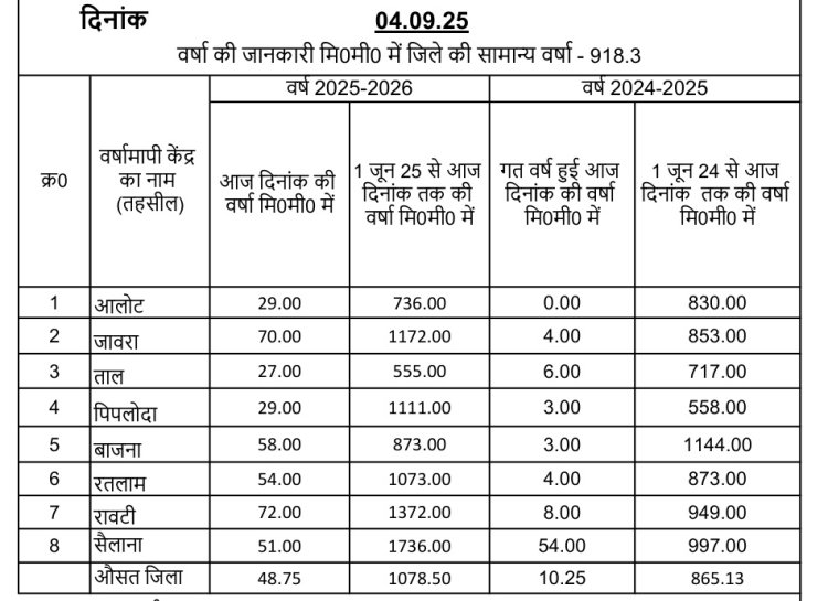 गुरुवार 4 सितंबर 2025 की सुबह 8 बजे तक बारिश के आंकड़े, दिन में हुई बारिश अलग है।
