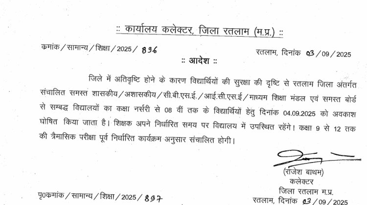 रतलाम. जिले में एक बार फिर बारिश का दौर शुरू हो गया है। 4 सितंबर 2025 को भी रतलाम जिले में भारी बारिश की चेतावनी है। इसके मद्देनजर बच्चों की सुरक्षा की दृष्टि से कलेक्टर राजेश बाथम ने जिलेभर के सभी नर्सरी से 8वीं तक के स्कूलों में 4 सितंबर 2025 गुरुवार को अवकाश घोषित किया है। हालांकि शिक्षकों व अन्य स्टाफ को स्कूल पहुंचना होगा।